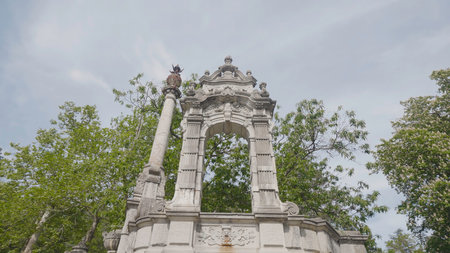 Beautiful stone arch with old fountain. Action. Beautiful fountain with stone arch in Crimea. Monument to Russian Emperor in Massandra Palace in Crimea
