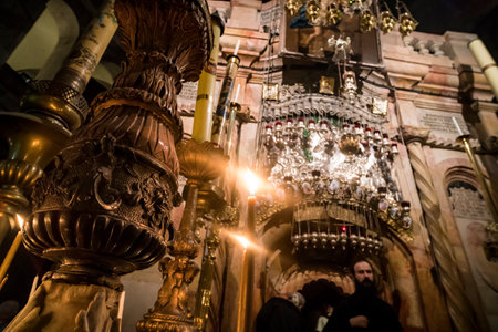 The sumptuousness of interior and of burning candles of the Church of Holy Sepulchre, Jerusalem, Israel: October 24, 2018