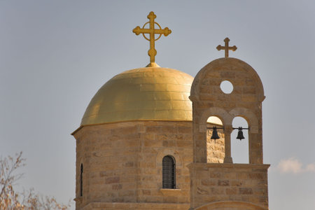 a church building adorned with golden crosses and symbols atop its roof, set against a backdrop of clear blue sky, radiating a sense of spiritual reverence and divine serenity