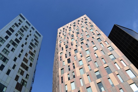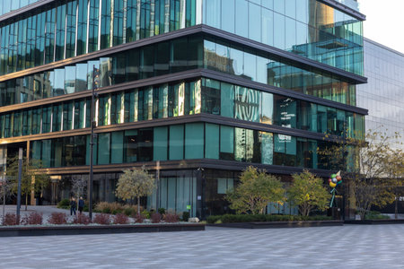 Grey sky reflected in the clean windows of the business center in Wroclaw, Poland