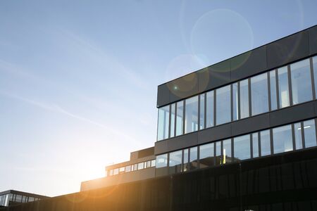 View of office building with sunrise, reflection and perspective. Bright outlook for business. Modern office block with sunny beautiful sky.