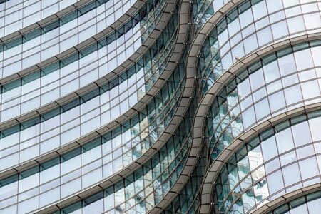 Conceptual image of textured window facade of modern design skyscraper office buildings in city business district, reflection in window surface pattern background .