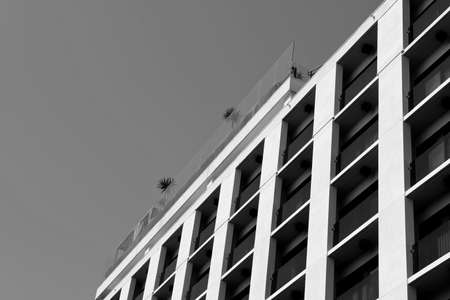 An abstract view looking at a modern concrete building. Artistic view of exterior architectural design and details. A modern building.