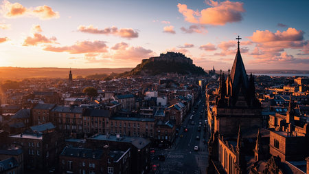 Cityscape at sunset with Edinburgh Castle on a hill and a church steeple in the foreground, bathed in warm light.