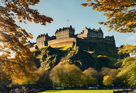 Explore the enchanting beauty of Edinburgh Castle, a historic fortress perched atop a hill, shrouded in mist with vibrant autumn foliage, creating a mesmerizing landscape.