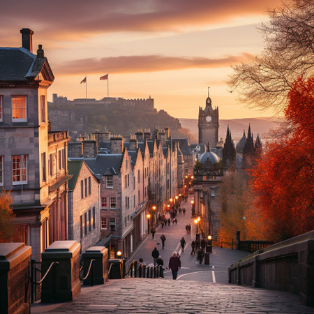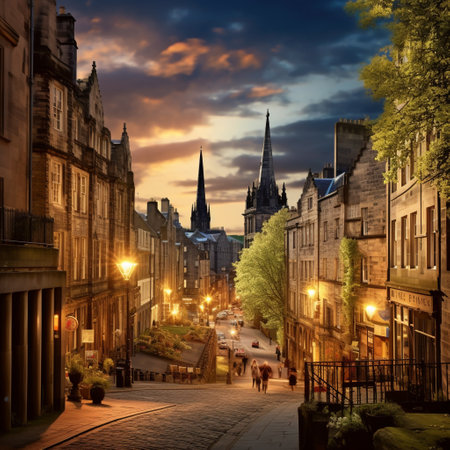 Immerse yourself in the enchanting beauty of Edinburgh with this image of a majestic castle perched on a hill, overlooking the city. Bathed in an ethereal glow, the castle stands as a timeless beacon of history and grandeur. In the foreground, a bustling street comes to life with people dressed in traditional Scottish attire, celebrating the city's rich heritage. Take a stroll along the picturesque Royal Mile, lined with charming shops and cafes, offering a glimpse into the vibrant heart of Edinburgh. And don't forget to experience the breathtaking views from Arthur's Seat, a rugged volcanic hill that offers panoramic vistas of the city. Finally, venture into the mysterious underground chambers of Mary King's Close, where flickering candle lights and shadows create an eerie ambiance. This captivating image perfectly captures the balance between beauty, history, and mystery that defines Edinburgh, evoking a wide range of emotions.