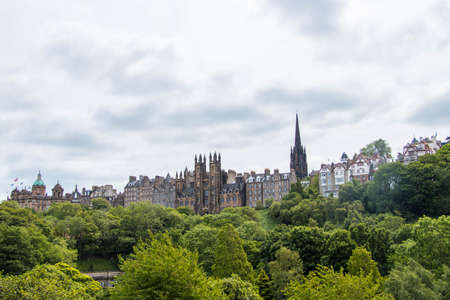 Row of old historic buildings behind large green trees in Edinburgh, Scotland in a cloudy rainy summer day