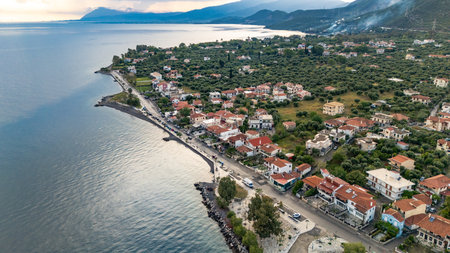 Aerial drone view of Marathias, a coastal village in Central Greece, showing the Gulf of Corinth shoreline, clear blue sea, traditional houses, and Mediterranean landscape. Scenic Greek coast, summer travel destination, high-angle drone shot.