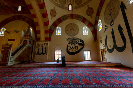 EDIRNE - TURKEY, MARC 9: Undefined muslims praying in Edirne Old Mosque on March 9, 2019. The Old Mosque is an early 15th century Ottoman mosque in Edirne, Turkey