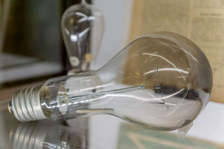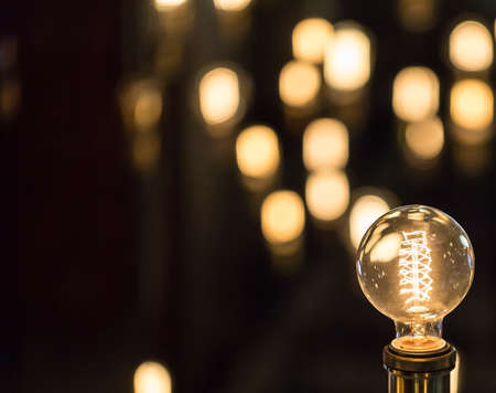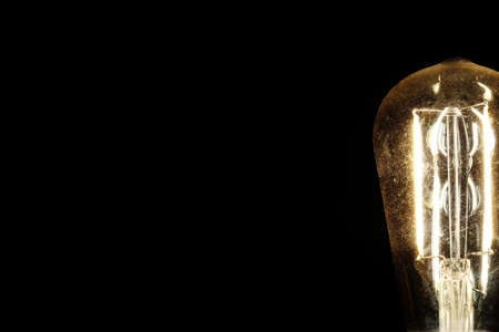 Close up of vintage Edison light bulb on dark background. Selective focus.