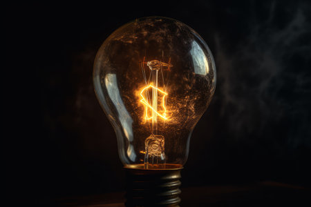 A burning incandescent light bulb with a dollar sign inside on a dark background
