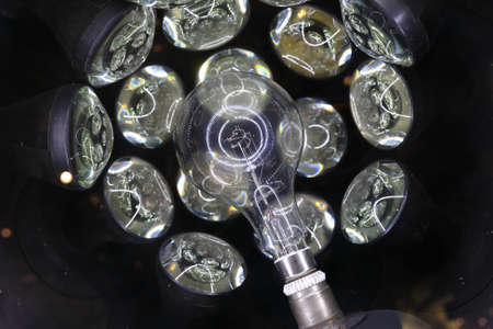 One lamp burns with warm light. Many incandescent lamps. Retro lamps.