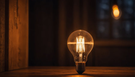 The glow of an Edison bulb creates an intimate setting, shining on a wooden surface. Its subdued light offers a nostalgic atmosphere, perfect for a rustic or vintage interior. AI generation
