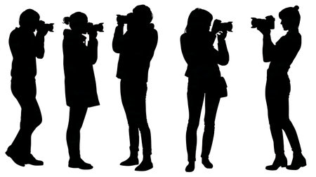 Paparazzi or photographers with high resolution cameras isolated at white background. People in different poses taking photo, using professional equipment. Set of cartoon characters with men and women