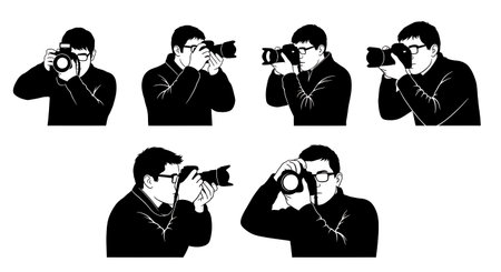 Black Solid Photographer Wearing Glasses Silhouettes Set of Six on White Background isolated on plain white background.