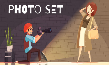 Photographer composition with indoor photographic studio interior and professional cameraman shooting female model with text vector illustration