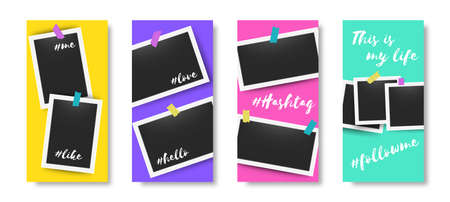 Social media editable story frames. Trendy banners with blank moment photos. Photographs attached to adhesive tape. Colorful templates set for network with and copy space. Vector snapshot mockup