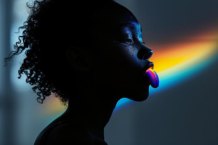 Artistic Silhouette of a Woman with Neon Light Projections and Flower