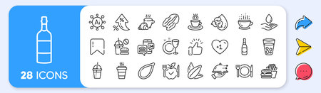Burger, Food delivery and Brandy bottle line icons. Interest rate, AI generate, Inflation icons. Pack of Restaurant food, Water care, Ice tea icon. Vector