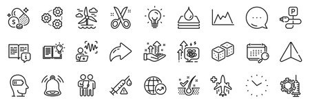 Charging parking, Coronavirus vaccine and Dice line icons pack. Share, Message, Paper plane icons. Survey, Anti-dandruff flakes, Weariness web icon. Gears, Waterproof, Stress grows pictogram. Vector