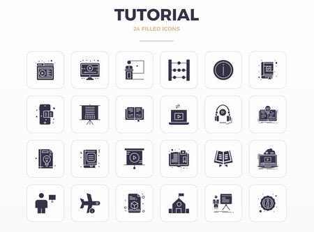 Contemporary collection of 24 vector icons representing Tutorial in SolidFill aesthetic, featuring 128x128 PIXEL perfect resolution for modern application development.