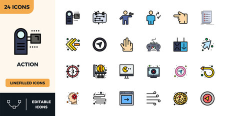 Complete package of 24 vector icons themed around Action, showcasing Flat Lineal Color design in 128x128 PIXEL perfect quality for modern interfaces.