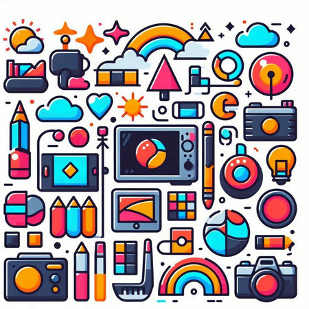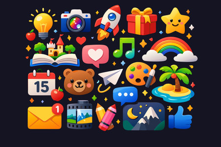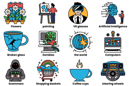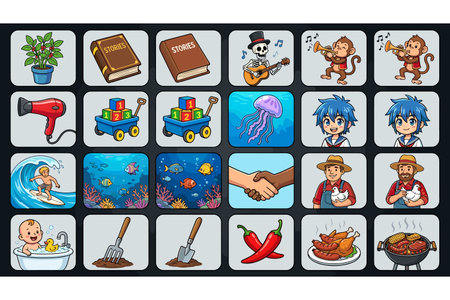 Assorted cartoon icons representing various objects and activities