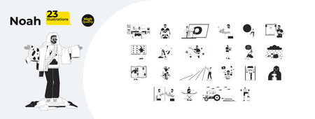 African american male character with lifestyle, emotions, work outline illustrations mega bundle. VR, eye tracking, consumerism 2D linear images isolated. Collection black and white vector drawings