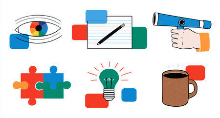 A collection of vibrant icons representing creativity, problem-solving, and inspiration, featuring an eye, a light bulb, and a coffee mug.