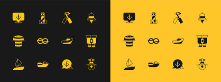 Set Ship bell Jet ski Inflatable boat with motor Anchor Nautical rope knots Crossed oars paddles and Lighthouse icon. Vector.