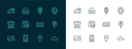 Set line Location taxi car Taxi driver license Stacks paper money cash Traffic light and service rating icon. Vector.