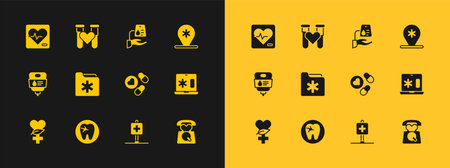 Set Location hospital Tooth with caries Medicine pill or tablet Medical health record folder Blood donation Heart rate and Test tube blood icon. Vector.