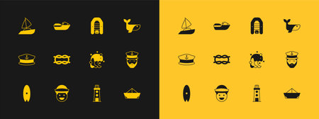 Set Whale Sailor Tsunami Lighthouse Nautical rope knots Inflatable boat with motor Yacht sailboat and Jet ski icon. Vector.