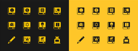 Set Book about geometry Ancient magic book User manual ecology Jewish torah and Financial icon. Vector.