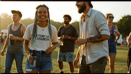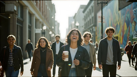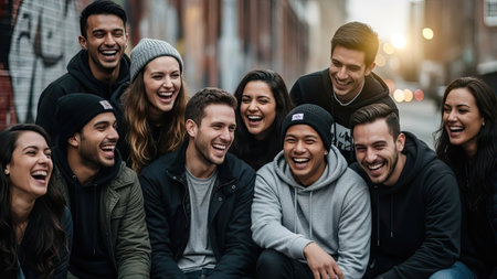 A diverse group of people shares laughter and joy in an outdoor setting. The image features natural lighting and a warm color palette. The subjects are engaged in a shared activity, conveying a sense of camaraderie. Suitable for illustrating themes of friendship, community, and social gatherings, as well as editorial purposes.