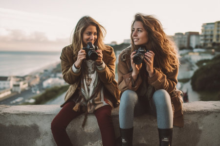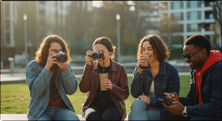 A group of four friends enjoying a sunny day outdoors, two holding cameras and two holding coffee cups, smiling and taking photos