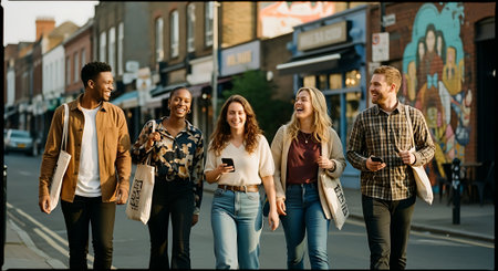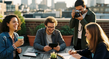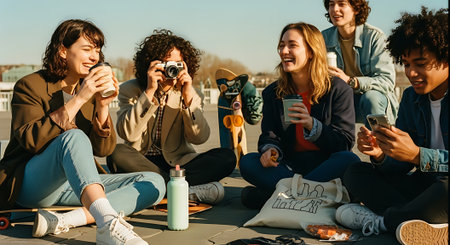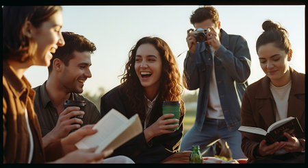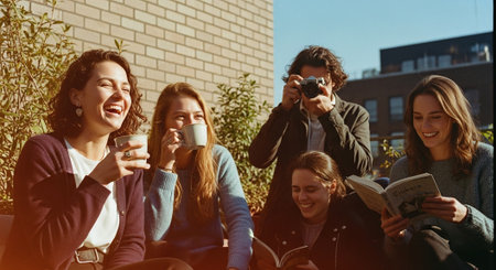 A group of five friends enjoying a sunny day outdoors, laughing and sharing moments, one person taking a photo, others holding cups and a book