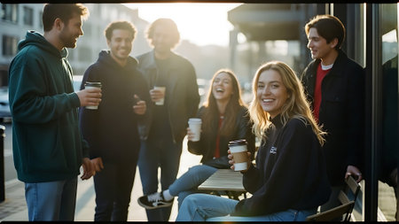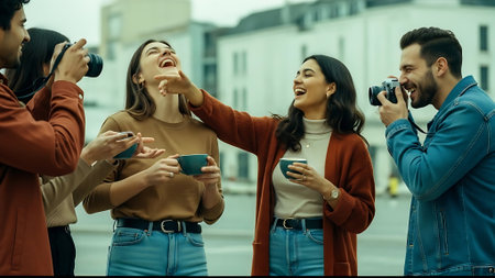 Group of friends taking pictures of themselves on the street. They are laughing and drinking coffee.