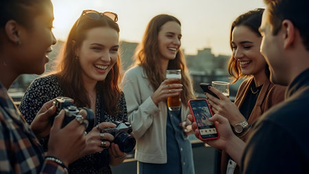 A group of friends enjoying a sunny day outdoors, laughing and sharing drinks, one person taking a photo with a camera