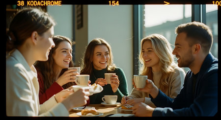 A group of young adults in a cozy cafe, engaging in conversation and activities, with a laptop and camera present