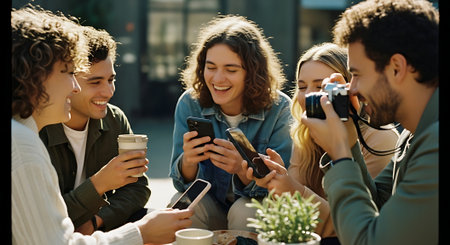 A group of young adults sit around a table, smiling and engaged with their smartphones and cameras, enjoying a social gathering on a sunny day.