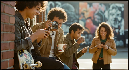 Group of five young people, some sitting on a brick wall, others standing, engaged with their phones and a camera, surrounded by urban graffiti and a skateboard.