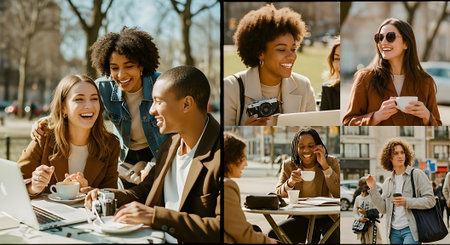 Collage of young adults laughing, chatting, and enjoying coffee together in an urban park setting with trees and buildings in the background.