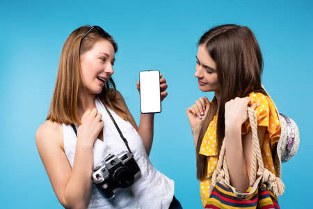 Young girls tourists look at the white screen of the smartphone. Blue background and space for your text or advertising. High quality photo