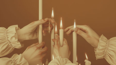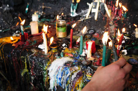 A picture of a woman holding a candle to perform magic rituals and mysteries about superstition in the concept of Divine magic & occultism on the old wooden table.