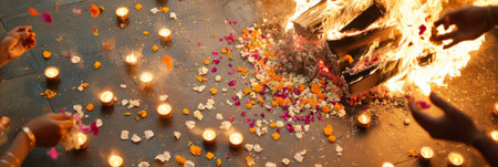 sacred fire burning during hindu religious rituals in local bengali culture. all the essential elements of puja are in the background. typical indian puja. close up shot.