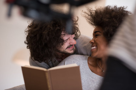 Young beautiful multiethnic couple hugging in front of fireplace at home when reading a book at autumn day