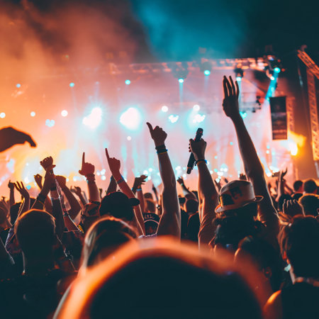 Crowd cheering at a music festival and raising hands in the air