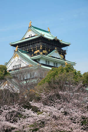 Beautiful Osaka castle with blooming cherry blossoms in Sakura spring season in Osaka, Japan