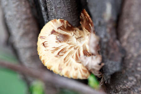 Texture of old pine close-up. Incredibly beautiful pattern. Mushroom grew on tree. Macro photography.